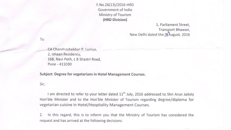 Petition updateDegree/Diploma for Vegetarians in Hotel/Hospitality Management CoursesSpread the Message : Admission process with Vegetarian Option started with NCHMCT