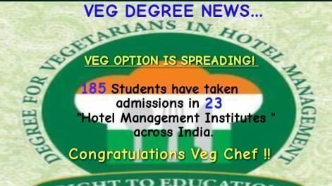 Dear Supporters for the cause, It's a great news for all of us. Now, it's 4th year of admission with Option of Learning "Veg only" in Hotel Management Courses. Every year, even though the option is declared in all the Topmost Institutes ( IHM ) without much publicity/awareness campaign by Government and the concerned Authorities, still Vegetarian Passionate Students have gone for it. More than 500 students have taken admission till date. The number of Institutes giving the option is now 63 which are all throughout India. All of us should create more and more awareness, so that there will be increase in number of students opting for admission as well as increase in number of Institutes at all levels giving option of learning "VEGETARIAN ONLY" - CA C R Luniya, Degree for Vegetarians, Pune 9822257474 VegDegree@gmail.com