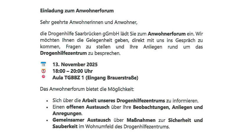 Am 13.11 um 18 Uhr lädt der Leiter des Drogenhilfezentrums zu einem Bürgerforum ein.