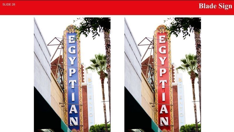 You can preview their slideshow now, which is still pretty light when it comes to specifics, but does show the neon blade sign on Hollywood Boulevard changed from Egyptian lapis lazuli blue to Netflix red, a switch that would require changes to color of the illuminating gas as well. We think the blue is more attractive.