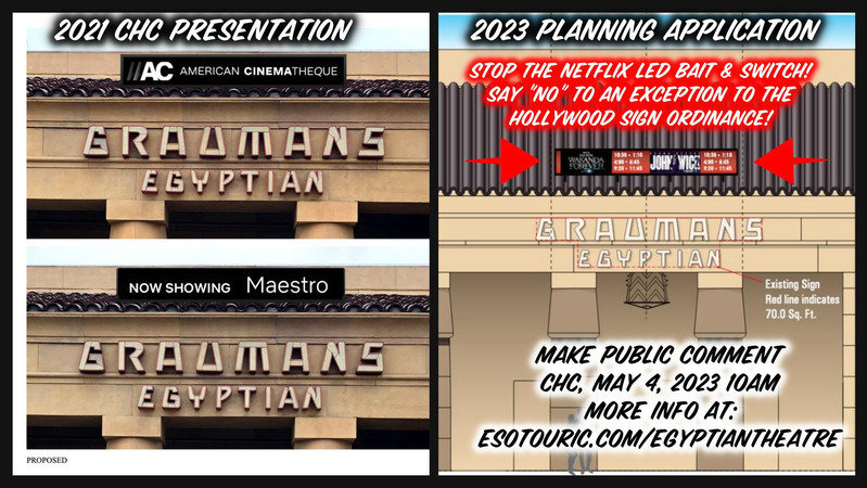 Please show up or call in (by phone or by Zoom) to give public comment on Agenda Item #4, objecting to the Netflix bait and switch request to install a non-historic, multi-colored LED sign on the tile roof of the Egyptian Theatre. This is very different from the monochrome sign in its 2021 presentations.