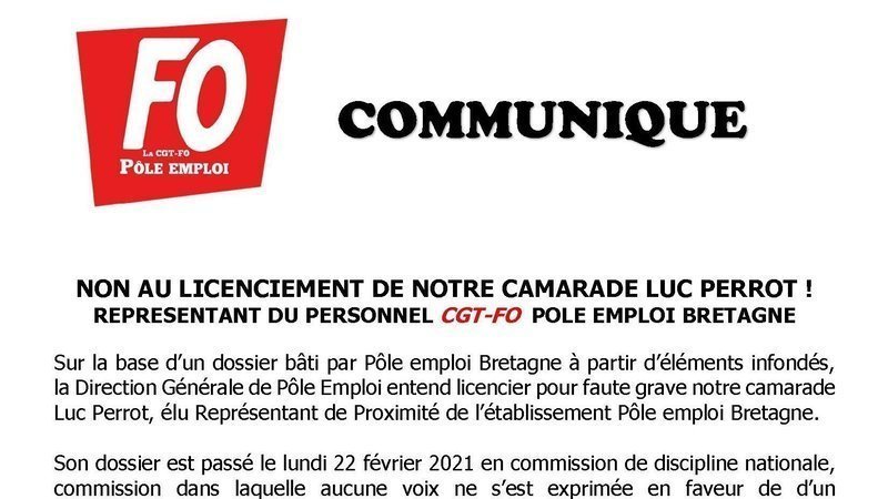 NON AU LICENCIEMENT DE NOTRE CAMARADE LUC PERROT ! REPRESENTANT DU PERSONNEL CGT-FO POLE EMPLOI BRETAGNE