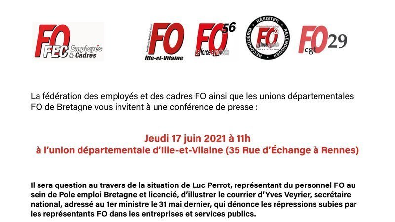 Il sera question au travers de la situation de Luc Perrot, représentant du personnel FO au sein de Pole emploi Bretagne et licencié, d’illustrer le courrier d’Yves Veyrier, secrétaire national, adressé au 1er ministre le 31 mai dernier, qui dénonce les répressions subies par les représentants FO dans les entreprises et services publics.
