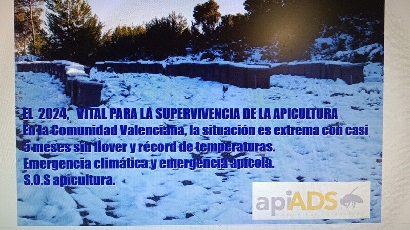 El año 2024 es vital para la supervivencia de la apicultura. En la Comunidad Valenciana, la situación es extrema con casi 5 meses sin llover y record de temperaturas. En las 3 últimas campañas el descenso de produccion supera el 70 por ciento, con unos precios ruinosos y un 50 por ciento de bajas de colmenas.