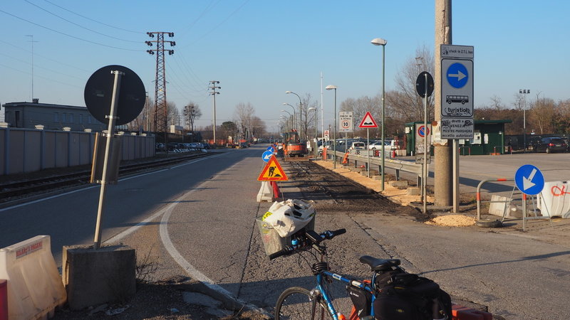Un mese dopo la firma del verbale di inizio lavori, è finalmente aperto il cantiere. Si comincia dal tratto più facile dal Vega e da via dei Petroli, strade poco trafficate; qui il tratto in via dei Petroli dove la ciclabile correrà tra la strada e i parcheggi. Il tratto più critico, gli ultimi infernali 800m prima del ponte, sarà prevedibilmente l'ultimo ad essere realizzato e c'è solo da auspicare che si riesca a completarlo prima dell'estate.