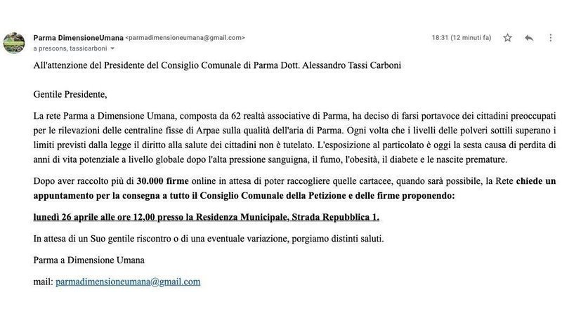 Petition updateSalviamo l’aria di Parma dall’inquinamento, insieme si può fareAbbiamo scritto al Presidente del Consiglio Comunale di Parma per consegnare le firme