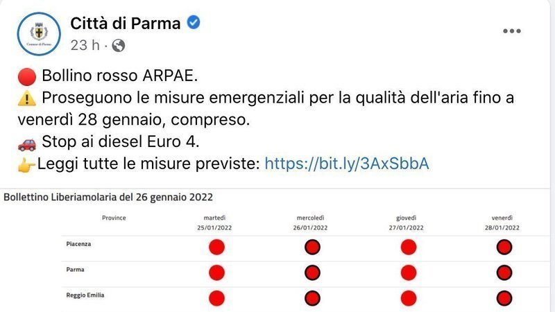 a Parma siamo all11° sforamento da inizio anno su 35 consentiti e il Blocco del traffico persiste da più dal 13 gennaio (15 giorni consecutivi)
