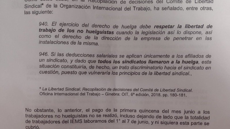 El sindicato SITIEMS que agrupa en su mayoría a los trabajadores administrativos del IEMS, durante el estallamiento de la huelga por el sindicato titular SUTIEMS, dejó en la indefensión a sus propios afiliados al negarse -incluso con instrucción de la asamblea, máxima autoridad- a pronunciarse por los derechos de los administrativos y contra los perjuicios que la huelga les trajo como la retención salarial durante una semana bajo la frase "hay que esperar, no se adelanten a los hechos"; es el primer comité que se repliega y alía con el patrón para "mantener a raya" a los trabajadores mientras ellos hacen sus negocios con la venta de plazas a docentes y promoción a administrativos. El negocio para ellos es jugoso.