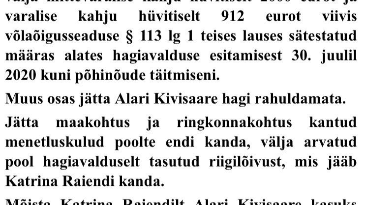 - Mõista Katrina Raiendilt Alari Kivisaare kasuks välja varalise kahju hüvitis 912 eurot.
