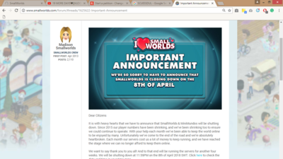 As most of you probably heard Smallworlds is planning to close down due to lack of funds on April 8th. Smallworlds holds memories, I remember when I first joined Smallworlds, 2014 I saw the picture and thought it looked fun , when I started playing I started making more and more friends, getting higher CL, and even learning more about myself. Now that they said they're closing down, I cant process it. PLEASE HELP THIS PETITION BE SUCCESSFUL , WE ONLY HAVE A WEEK! #Standforsw