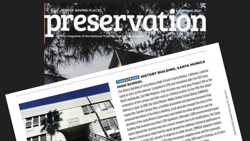 "Nationwide attention from the National Trust for Historic Preservation has come to the History Building on the Santa Monica High School campus, which is nevertheless still slated for demolition. Efforts by the Santa Monica Conservancy to stop the demolition of the highly significant PWA Moderne structure have resulted in an adopted preservation policy in the school district for the future. Preservationists remain frustrated that a professionally conducted adaptive reuse study was never done for the History Building, and will be watching closely as other campus plans in the district move forward."