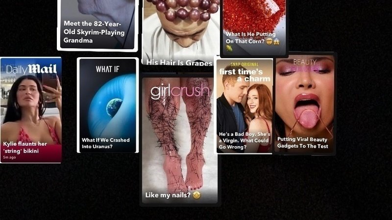 Even if the discovery page is “personalized” it still shows super obnoxious things. As of right now I just scrolled down 3 times on there and saw “what if we crashed into Uranus” “What is he putting on that corn���?” “He’s a bad boy. She’s a virgin. What could go wrong?” Literally why would you want that on your Snapchat it’s so annoying. Especially if the app is 13+ But even then there are still younger kids on that on their moms phone or something. Do you think 13 year olds should be seeing that? No it’s just weird please get rid of it.