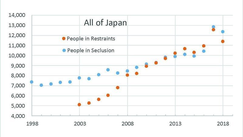 The “630 report”, which publishes health statistics in Japan and is the main source to track the numbers of restraints over time, is now available for the period 2018. It provides a snapshot of the numbers of people in restraints on June 30 of each year. The methodology was changed in 2017 so that the numbers appears to have jumped then, but the numbers of restraints have fallen for nearly the first time from 2017 to 2018. Although June 30 2017 was after Kelly passed away, it was before the publicity started in July. So it seems that our efforts have had a modest effect, with restraint use dropping about 9% between 2017 and 2018 across the whole country, and about 5% in Kanagawa prefecture, where Kelly was tied up in Yamato Hospital.