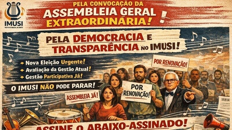 Os(as) músicos(as), voluntários(as), integrantes da comunidade cultural e apoiadores(as) do Instituto Musical de Ibirité, abaixo assinados, vêm, por meio deste documento, manifestar preocupação com a condução da atual diretoria, bem como solicitar formalmente a convocação de uma Assembleia Geral Extraordinária, nos termos do Art. 14, inciso III, do Estatuto da instituição, que garante esse direito a 1/5 (um quinto) dos membros.