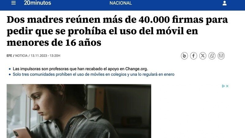 Quería contaros también que la petición de Ángela (link aquí) pide exactamente lo mismo que yo (prohibición de uso de teléfonos en los niños) pero que en su caso el límite de edad que puso fue 14 y no 16. A pesar de esa pequeña diferencia (ambas tenemos nuestros argumentos para optar por esos dos límites de edad diferentes) el objetivo que perseguimos es el mismo así que hemos considerado que aún así tenía sentido unirnos en una misma petición.