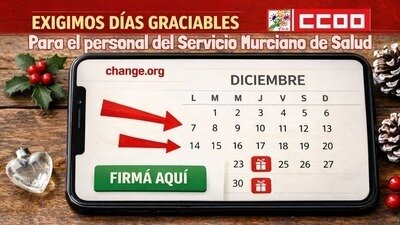 Desde la FSS-CCOO Región de Murcia pedimos al Servicio Murciano de Salud (SMS) que considere los días 24 y 31 de diciembre como días graciables para todo el personal, tal y como se aplica en el resto de la Administración Pública de la Región de Murcia.