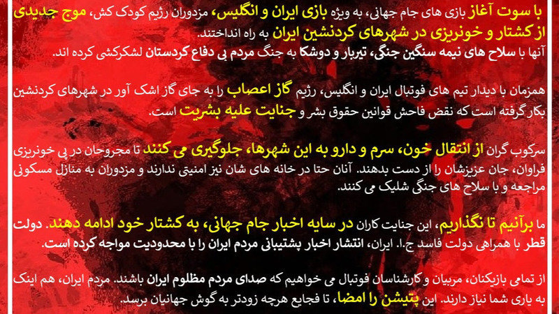With the whistle for the start of the World Cup games, specifically the Iran-England match, the mercenaries of the child-killing Islamic Republic regime launched a new wave of crackdown and bloodshed in the Kurdish cities of Iran.