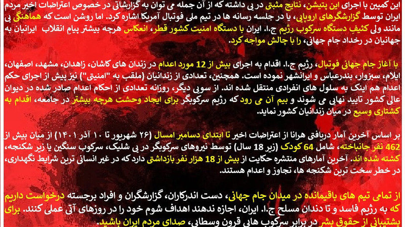 We ask all players and coaches in the teams still in the World Cup, all remaining reporters and other dignitaries present, to support the Iranian people, and to NOT allow the corrupt and fully armed security forces of the barbaric regime to implement their sinister goals in the coming days. Be IRAN’s voice and support human rights against the Islamic Republic’s medieval oppression.