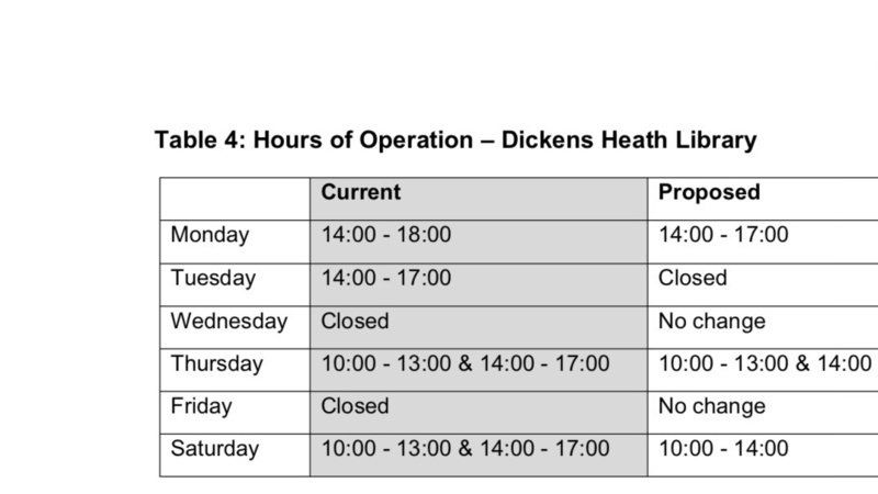 A report is before the Cabinet Member for Stronger and Safer Communities on Tuesday 24 September to reduce the opening hours of Dickens Heath Library. Proposed changes will mean it being closed an additional day on a Tuesday and Saturday afternoon.
