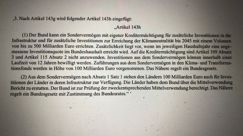 Nun hat man schon den Gesetzentwurf ausformuliert...mit absolut zukunftsirren Formulierungen...hin zu einer Zielvorgabe der " Klimaneutralität bis 2045 "...Eine Klimaneutralität als errechenbar in ein Gesetz zu schreiben ...ist vergleichbar mit der völlig fehlerhaften Pandemie-Inzidenz 35/7/100.000 im Infektionsschutzgesetz, welches auch im Turbomodus an einem Tag durch alle Instanzen gepeitscht wurde.