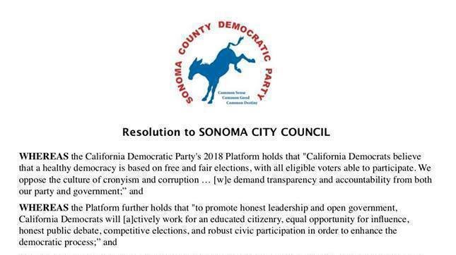 IT IS HEREBY RESOLVED, that the Sonoma County Democratic Party calls on the Sonoma City Council, including the past-endorsed members Madolyn Agrimonti and David Cook, to reconsider their decision to block the citizen petition, and instead place the matter on the November 2018 ballot, in the interest of promoting free and fair elections, with all eligible voters able to participate, and to publicly take a clear stand in favor of transparency and accountability, and against corruption and cronyism.