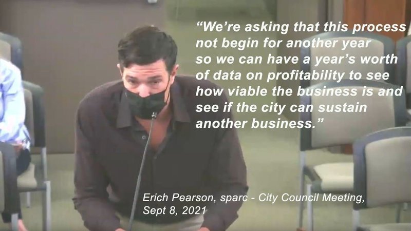 Mr Pearson pleaded poverty and asked the city council to delay the RFP for another year to allow sparc to gather 12 months’ worth of data. This would show “how viable the business is and see if the city can sustain another business.” Two months after making his plea to the city council, it agreed to table the RFP until the end of 2022.