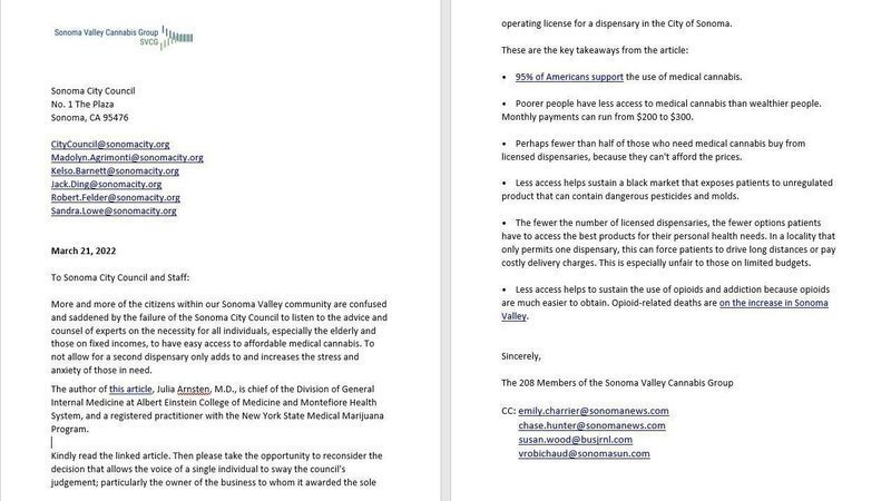 More and more of the citizens within our Sonoma Valley community are confused and saddened by the failure of the Sonoma City Council to listen to the advice and counsel of experts on the necessity for all individuals, especially the elderly and those on fixed incomes, to have easy access to affordable medical cannabis. To not allow for a second dispensary only adds to and increases the stress and anxiety of those in need.