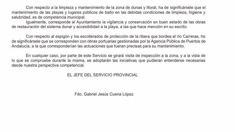 We also contacted the Provincial Coastal Service regarding the cleaning and maintenance of the dune system and the littoral. The letter sent to them has already been shared with you in a previous update. We had to repeatedly insist with its Division in Huelva and the Ministry in Madrid for get a response which I am now enclosing. The Coastal Service responded confirming that this point is the Town Council's responsibility. I have already sent their response to the Town Council.