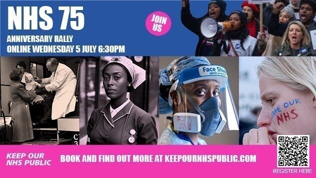 Our NHS at 75 online rally (please register in advance here) will focus on how vital it is that we mark the 75th Anniversary by using the spotlight under which the NHS will fall this year to make our demands and organise to save our NHS