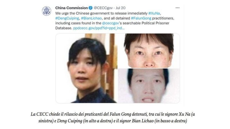 In un altro tweet, la CECC ha chiesto al PCC di rilasciare immediatamente le signore Xu Na e Deng Cuiping e il signor Bian Lichao, così come tutti gli altri praticanti detenuti, compresi quelli nel loro database dei prigionieri politici.