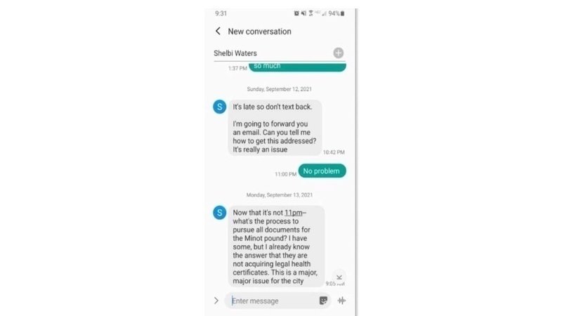 This week we will focus on the “back door” to the city. These series of text messages from Shelbi Waters to the city clerk of Minot will be self explanatory. They are also full of bashing of Minot Pound and other organizations. I can only post one screenshot per day.