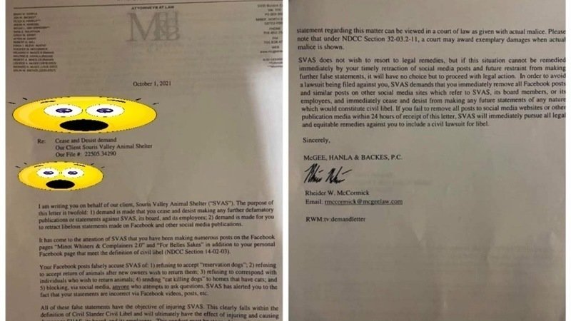 The picture today is of one of many Cease and Desist papers that were served on citizens of Minot. These papers not only are harmful to the community, but are a waste of donation money. These letters are for questions that are asked of a nonprofit from people that have concerns of the business practices of Shelbi Waters as ED of SVAS that affect the entire states rescue community.