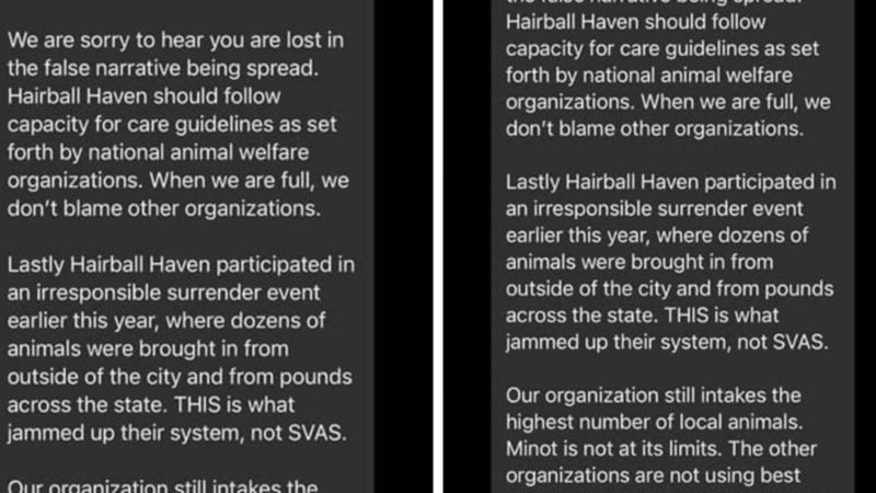 2. Capacity for care: Hairball Haven pulls cats from Minot only and only ones that are not claimed by owners. Some of these cats are from SVAS adoptions that they would not responsibly take back into their care. So SVAS is directly impacting other rescues here.