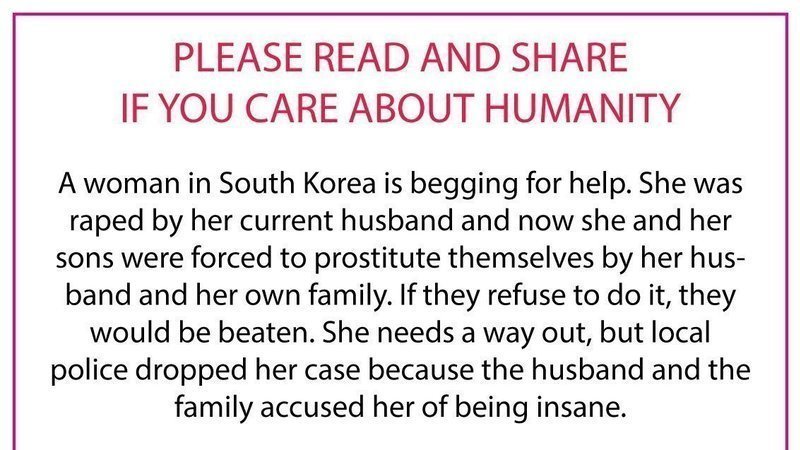 This petition's sole purpose is to bring to justice all the sexual offenders of Lee Jung Hee and her sons, and to shut down the prostitution ring she was forced to participate in. For years, she and her sons have been raped by dozens of people, abused by her own family members, and kept prisoner in an abusive and unhealthy marriage. The extent of her story is so horrific, I cannot summarize it in words. I will post her story below and ask that as many people as possible share this story with local Korean news outlets, international media, Facebook, Twitter, Instagram, anything to make sure her story is told. I ask that you use the hashtag #HelpLeeJungHee to spread her story. Let us expose the truth, and find justice for her and her family. Thank you. Lee Jung Hee's Story + Son's Account
