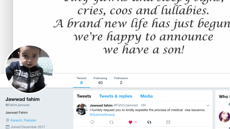 A desperate father has taken to twitter @FahimJawwad since December 2017 to beg for an Indian visa for his two-year old son. The child has congenital heart disease and needs to be operated upon . The family has attached doctor's notes with their visa application but despite the passage of over 60 days there is no response. Feel so helpless. Please ask @SushmaSwaraj to help. #Heart2Heart #InHumanitysName.