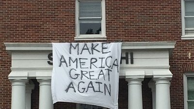 The Sigma Chi fraternity building has hung a giant banner off its balcony saying "Make America Great Again". Since they are a university affiliated organization and this is a highly polarizing election, some students have expressed that it's inappropriate for them to display blatant support-especially as many diverse prospective students visit our campus and pass by this everyday. This banner represents a candidacy where extremely hateful rhetoric has been spewed and many students feel unsafe and unwelcome as a result of such prominent organization on campus displaying this banner. We urge them to take it down and to instead privately express their opinions in order to maintain a classy, neutral, and welcoming of ALL students university environment.