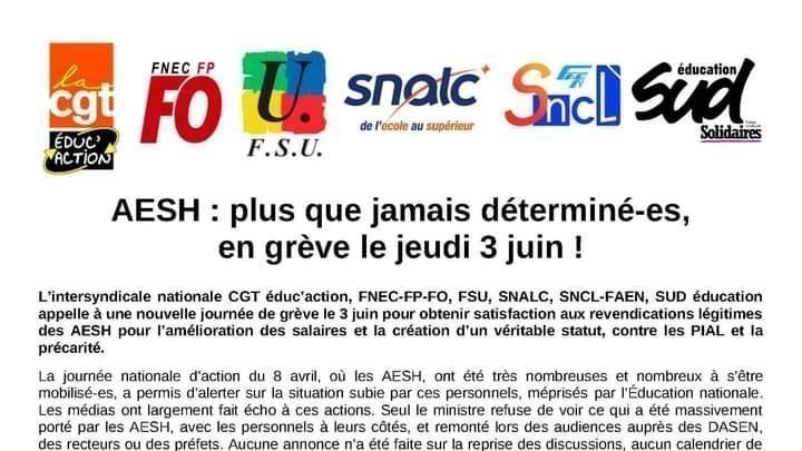 Le 3 juin, mouvement national des AESH. Nous comptons sur les 110000 AESH, pour une forte mobilisation. Nous devons en finir du désastre de l'école inclusive dans notre pays. Nous comptons sur la présence des enseignants et des parents, pour dénoncer cette MALTRAITANCE INSTITUTIONNELLE ORGANISÉE.