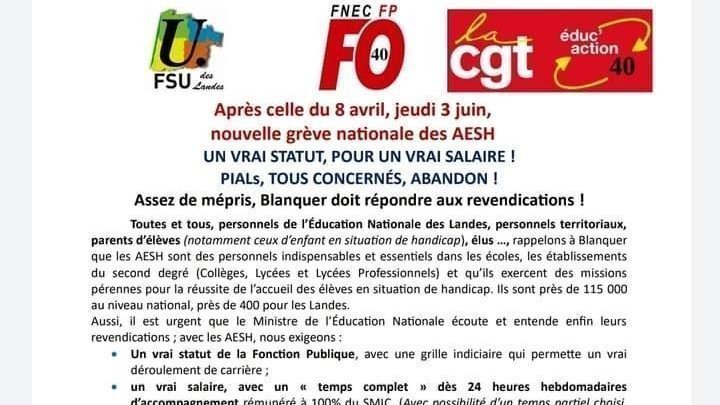 Je représenterai la CGT éduc'action des Landes lors de la réception d'une délégation d' AESH à la DSDEN de Mont de Marsan.