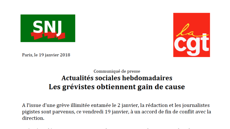 A l’issue d'une grève illimitée entamée le 2 janvier, la rédaction et les journalistes pigistes sont parvenus, ce vendredi 19 janvier, à un accord de fin de conflit avec la direction.