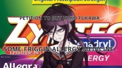 Although she's a fictional character, Toko Fukawa from the danganronpa series is a beloved character. For those who don't know; one of the reasons she's popular among fans is because this character has DID (Dissociative Identity Disorder) and upon sneezing or falling unconscious can switch between herself and a serial killer know in the series as Genocide Jack. Well, if something as simple as a sneeze can make her switch, why not do the obvious and spend 30$ on a box of cough medicine? It's simple, yet nobody seems to realize. Imagine how sucky having a cold or literally the entire season of spring must be. Thus, this petition is for spike chunsoft, the creators of danganronpa, to buy her some medicine.