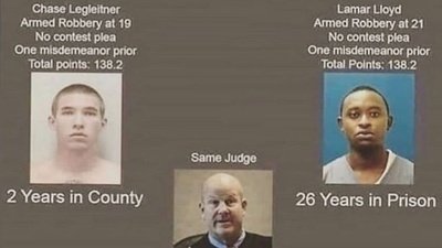 In 2018 a picture of two men with different sentencing went viral. One was a white man (Chase Legleitner) and the other was a black man (Lamar Lloyd). Both were charged with the same crime, both had the same total points, and both had the same judge (Sherwood Bauer Jr). However, the only difference was Lamar Lloyd was given a longer sentence (26 years) and Chase was ONLY given 2 years. Now in 2020 the same picture is going viral. The issue is that the judge is racist. He has a past of giving black people or anyone with darker skin a longer sentence than their white counterparts. We, as a society, need to get him and many other racist judges out of our justice system to see a change!