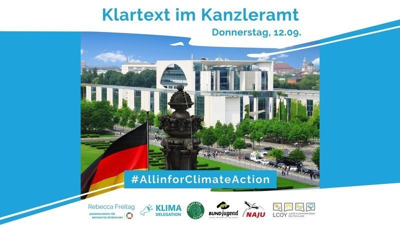 am Donnerstag gehe ich gemeinsam mit Vertreter*innen von der Klimadelegation, der BUNDjugend, der Fridays for Future-Bewegung, der Local Conference of Youth Deutschland (LCOY) und der NAJU ins Kanzleramt. Wir sprechen mit dem Chef des Kanzleramts, Helge Braun, und fordern eine ambitionierte Klimapolitik. Bitte helft heute noch mal mit, und teilt diese Petition, per E-Mail oder in den sozialen Medien! Helft ihr mir, 50.000 Unterschriften vollzumachen? Bitte teilt meine Petition (hier der Link: Change.org/AllinforClimateAction-Germany)!