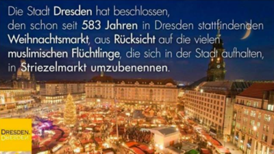 Aber mal im Ernst. Schön, dass auch mal einer der Besorgten™ merkt, dass der Weihnachtsmarkt in Dresden nun mal Striezelmarkt heißt. Und obwohl das schon seit Jahrhunderten so ist gibt es nun tatsächlich die Aufforderung ihn umzubenennen. Zumindest wird mit einem gefälschten Bild suggeriert, die Stadt Dresden würde den Markt erst jetzt wegen den Flüchtlingen in Striezelmarkt umbenennen.