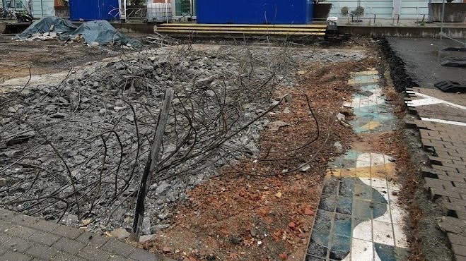 Die Fliesen wurden am 13.09. 2022 mit einem Bagger entfernt und dabei zerstört.