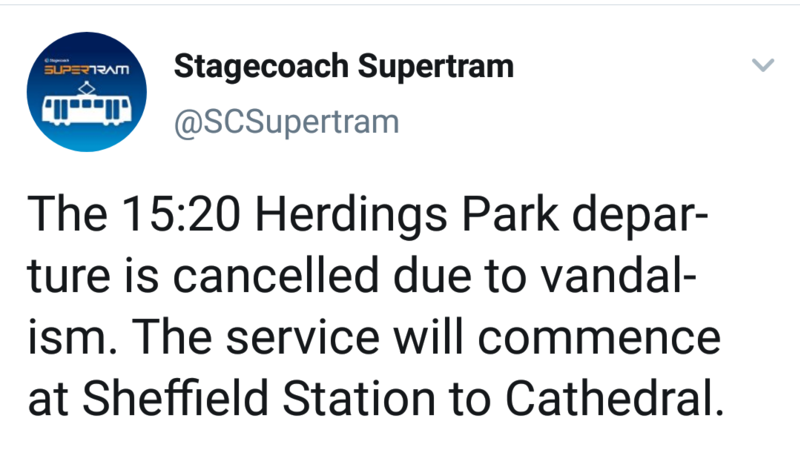 "The 15:20 Herdings Park departure is cancelled due to vandalism. The service will commence at Sheffield Station to Cathedral"