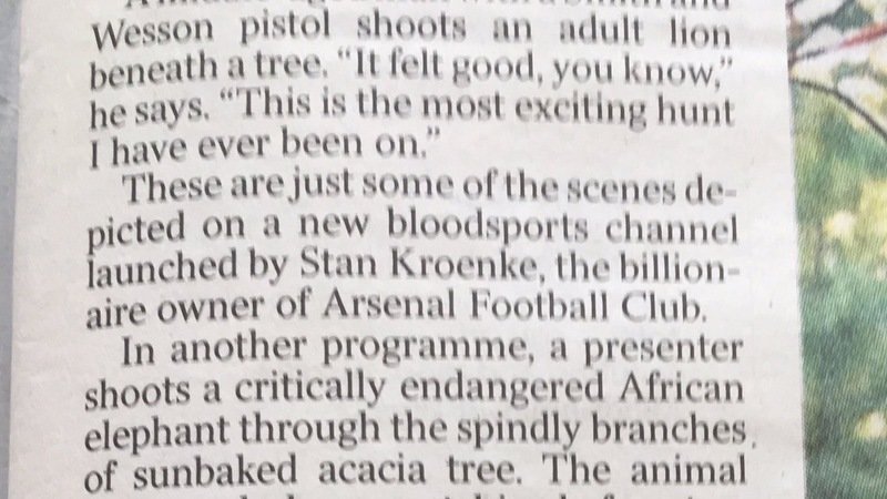 Petition updateDemand that Arsenal FC owner closes UK blood sports hunting channel #noclosurenomoneyMore evidence on Arsenal Owner's Bloodsport TV Channel