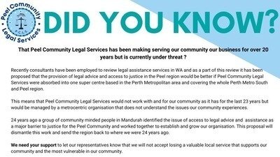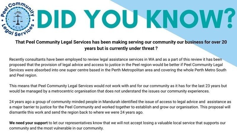 We, the undersigned, are residents and supporters of the Peel region, and we strongly oppose the proposal of a merger of Peel Community Legal Services with an organisation in the metropolitan area or the removal of management to an authority outside of our local community.