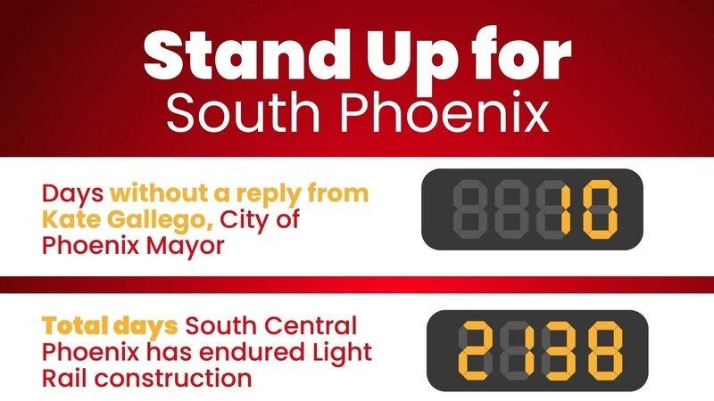 Petition updateStand Up for South Phoenix! Protect our Community from Prolonged Light Rail Construction.2,138 Days South Central PHX has Endured Light Rail Construction!