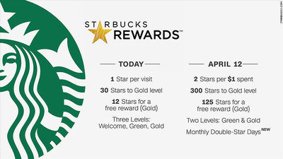 Starbucks currently awards 1 star to a member for every purchase they make, and they get a free drink every 12 stars ("The Lucky Dozen"). Starting tomorrow, April 12th, Starbucks will give a free drink every 125 stars. They justify this by giving 2 stars for every $1 spent.