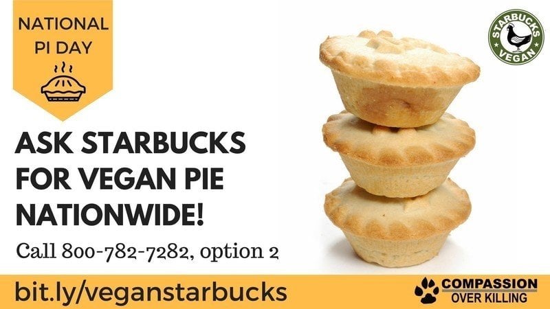 It’s 3/14, better known as Pi Day, and wouldn’t it be sweet to celebrate by indulging in vegan pie at your local Starbucks? Help make this a reality by calling Starbucks TODAY at 800-782-7282 and asking for vegan pie nationwide (use our sample script below)!